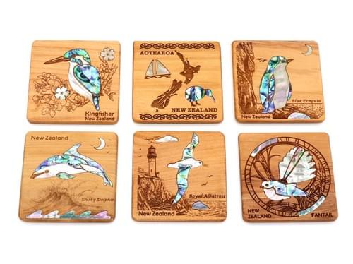 These fridge magnets are made from New Zealand native timbers such as rimu, matai, and totara, with various seashells delicately inlaid to form unique patterns.